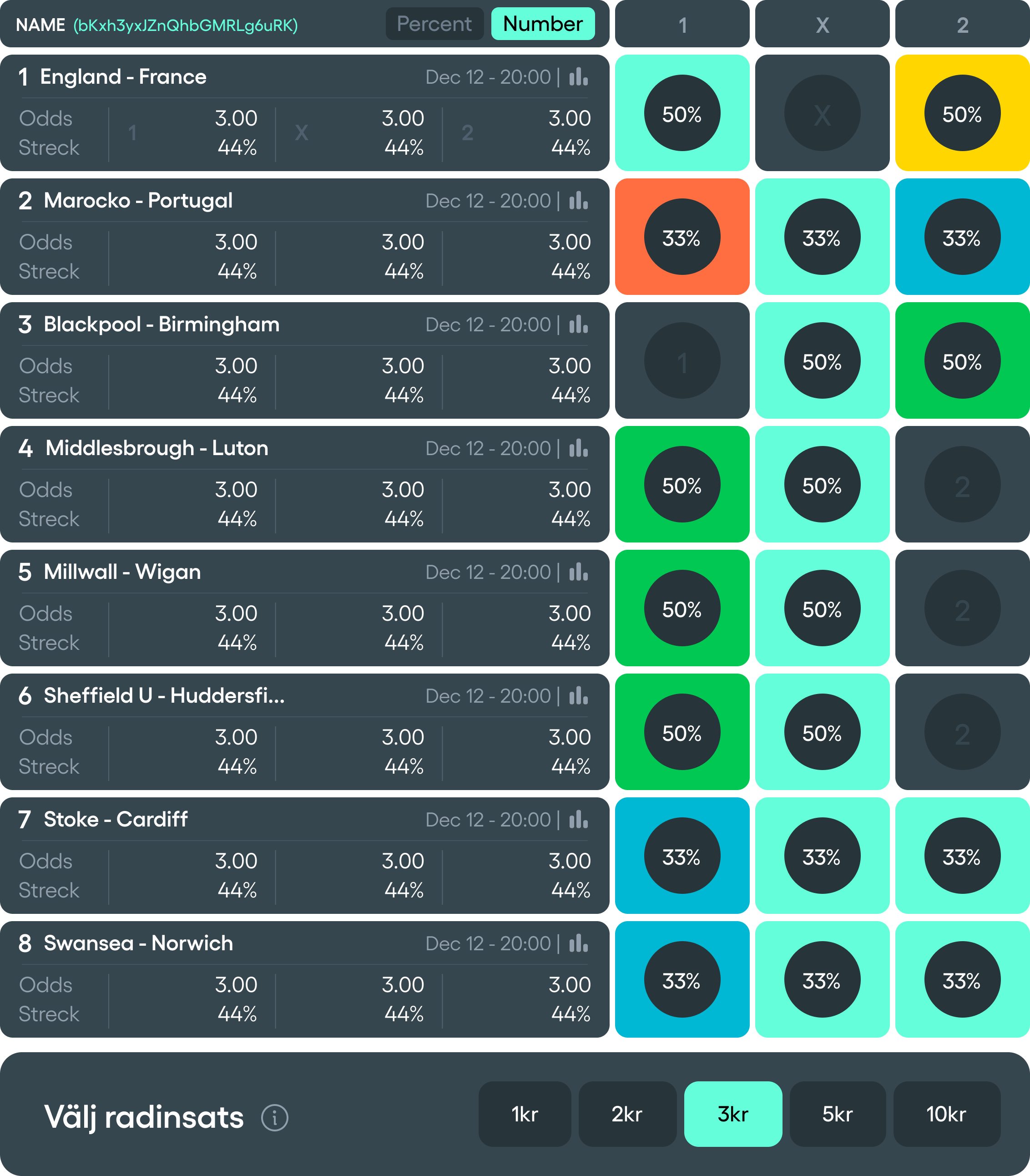 | # | |Lag | |Info | |Resultat | |Tecken | |Procent |